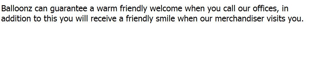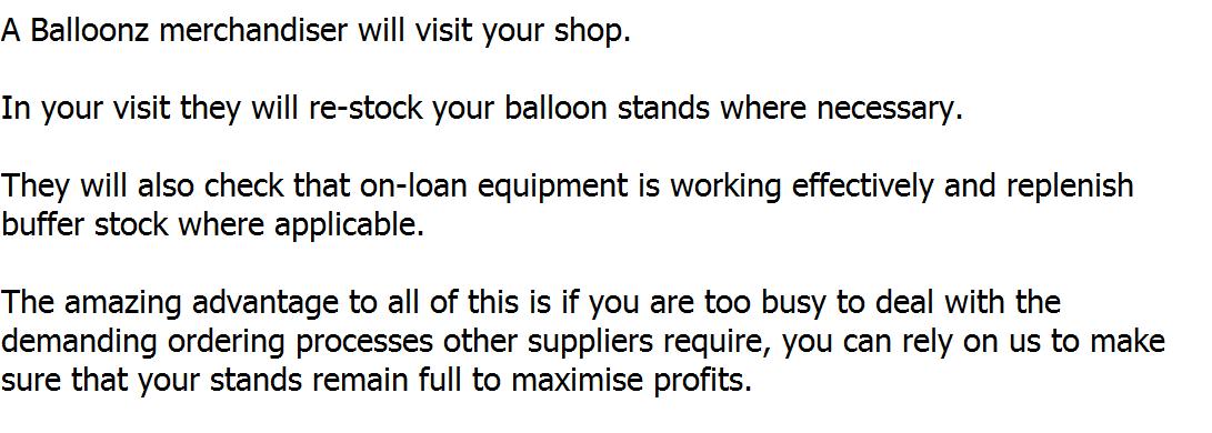 Balloonz is the only balloon wholesaler and distributor in the UK which offers a full merchandising service which saves you labour time. Our responsive ordering system will also reduce stock outs. A comprehensive no quibble product guarantee helps to avoid redundant or slow moving stock, whilst enabling you to take full advantage of seasonal trends. We have the widest variety of balloon designs and type which is tailored to each individual site, thereby maximising sales volumes. We are continuously reviewing our licensed balloons, thereby ensuring that you receive the latest designs, where appropriate, at the earliest opportunity. We are also competitively priced to maximise your margins.